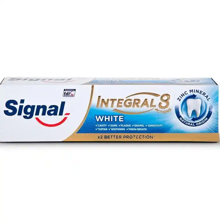 خمیردندان سفید کننده سیگنال مدل Integral 8 White با فرمولاسیونی حاوی زینک با منشاء طبیعی، حفاظت گستردهای را برای دهان و دندانها فراهم میآورد. این محصول بر پایه فناوری اختصاصی برند سیگنال طراحی شده و در آن از ترکیباتی نظیر فلوراید سدیم و زینک مینرال، سیترات و گلوکونات بهره گرفته شده است تا در برابر طیفی از مشکلات رایج دهان، از جمله پوسیدگی، التهاب لثه، و تجمع پلاک، عملکرد مؤثری داشته باشد.