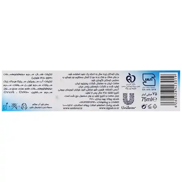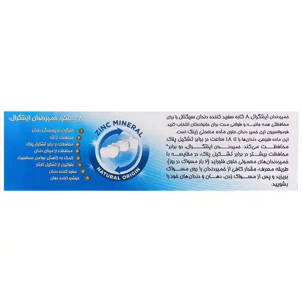 خمیردندان کامل سیگنال اینتگرال 8 کاره سفیدکننده، با فرمولاسیون حاوی زینک طبیعی، محافظت کامل از دهان و دندان ارائه میدهد. این محصول با 8 مزیت شامل جلوگیری از پوسیدگی، محافظت لثه، پلاک، مینا، کاهش حساسیت، جلوگیری از تارتار، سفیدکنندگی و خوشبوکنندگی، محافظتی دو برابر بهتر در برابر پلاک فراهم میکند.
