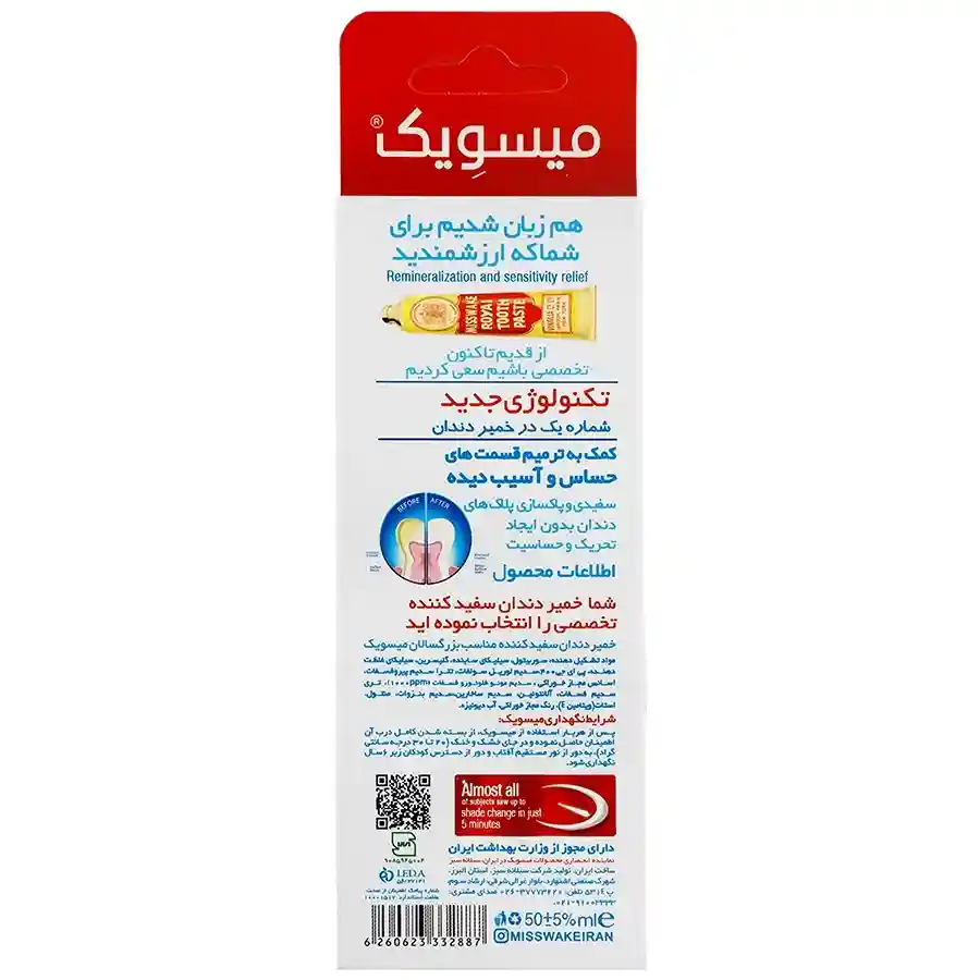 خمیر دندان میسویک Just In 5 Minutes محصولی با کیفیت و ساخت ایران است که به طور اختصاصی برای بزرگسالان طراحی شده است. این محصول با فرمول ایمن و مواد فعال استاندارد، امکان سفید کردن دندانها در مدت کوتاه و ترمیم نواحی حساس و آسیب دیده دندان را فراهم میکند. همچنین این خمیر دندان حاوی فلوراید است که نقش مهمی در محافظت از مینای دندان، پیشگیری از پوسیدگی دارد.برای داشتن لبخندی درخشان، و محافظت از سلامت دهان و دندان خود میتوانید این خمیر دندان را از مسواکالا تهیه کنید و با خیالی آسوده، از مراقبتی ایمن بهرهمند شوید و اعتماد به نفس خود را افزایش دهید. برای انتخاب بهترین محصول متناسب با شرایط دهان و دندانهای خود، روی آیکون واتساپ پایین سمت راست صفحه بزنید. دندانپزشکان مسواکالا بهصورت رایگان شما را راهنمایی میکنند تا خریدی مطمئن و متناسب داشته باشید.