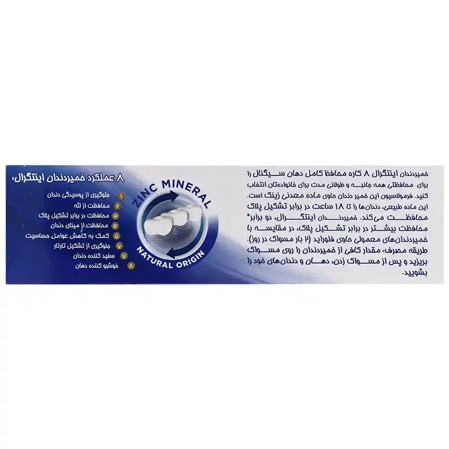 خمیردندان Signal Integral 8 Complete با زینک طبیعی، محافظتی 8 کاره و کامل شامل جلوگیری از پوسیدگی، محافظت از لثه، پلاک، مینا، کاهش حساسیت، جلوگیری از تارتار، سفیدکنندگی و خوشبوکنندگی دهان ارائه میدهد. همچنین محافظت 2 برابر بهتر در برابر پلاک تا 18 ساعت را دارد.