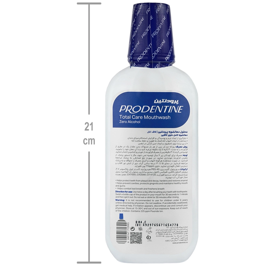 دهان شویه کامل پرودنتین مدل total care، بدون الکل می باشد که با مراقبت کامل از دهان و دندان، ازایجاد جرم و پوسیدگی روی سطح دندان جلوگیری کرده و باعث افزایش استحکام مینای دندان میشود. همچنین این دهان شویه ازالتهاب لثه نیز جلوگیری میکند.