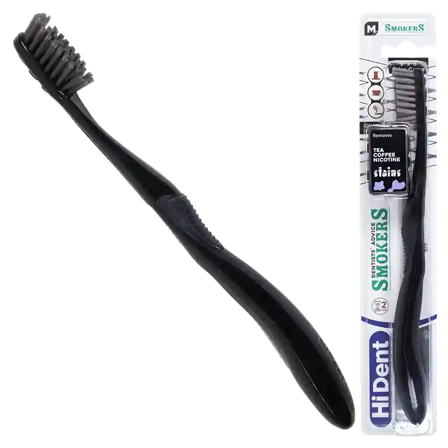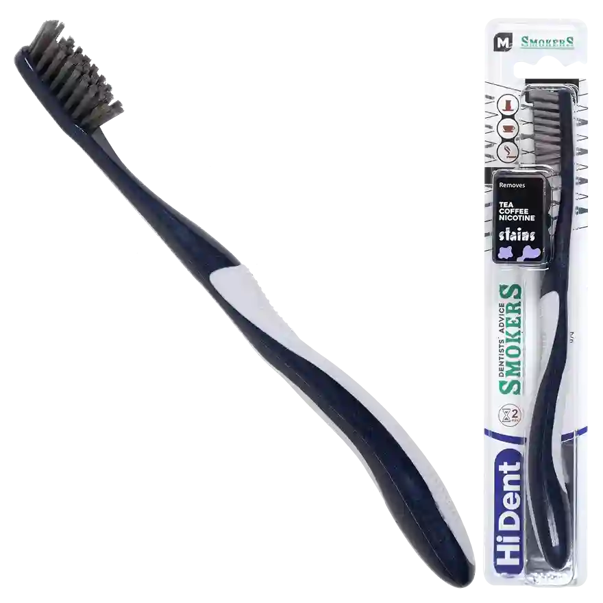 مسواک هایدنت مدل زغالی مخصوص افراد سیگاری با برس متوسط، مناسب سفید کردن دندان ها و از بین بردن لکه های قهوه و چای و جرم ناشی از دود سیگار.
