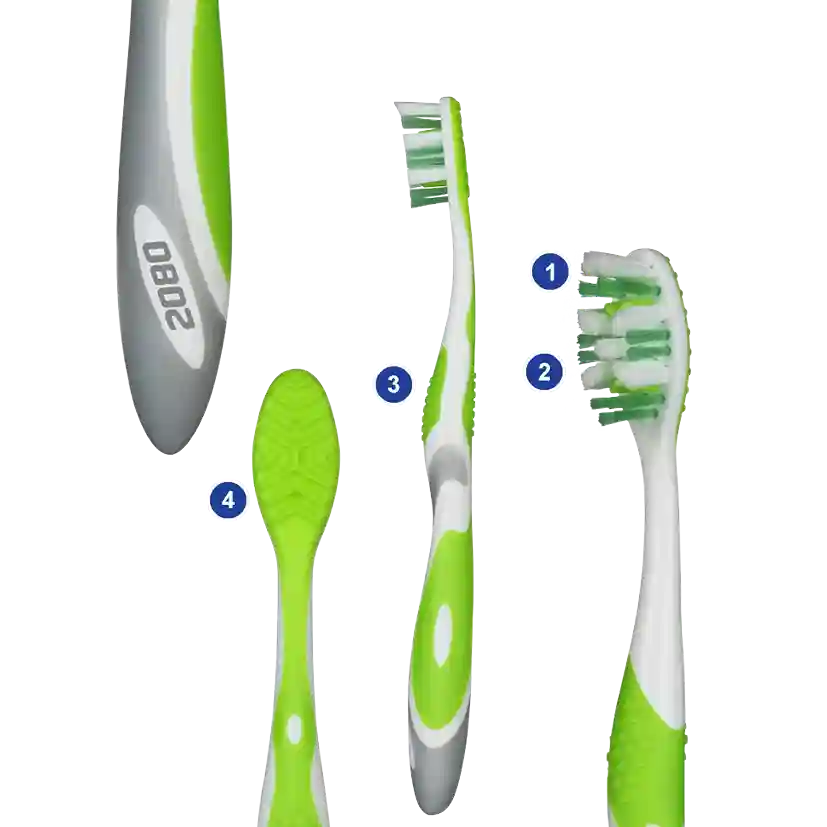 - 80٪ تمیزی بیشتر: طراحی خاص الیاف با برشهای علمی و دقیق، امکان پاکسازی عمیق بین دندانها و فضاهای دور از دسترس را فراهم میکند. این یعنی 80 درصد تمیزی مؤثرتر نسبت به مسواکهای معمولی.
