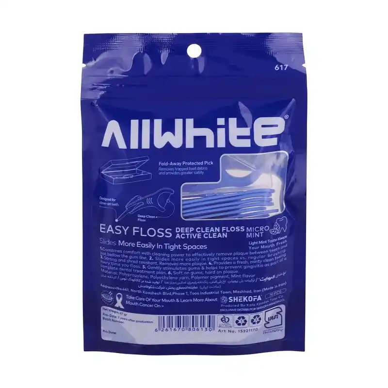 - مقاومت در مقابل ریشریش شدن و پارگی: نخ دندان آل وایت از الیاف بادوام ساخته شده که در برابر کشیدگی مقاوم است و بدون رشتهرشته شدن، بهراحتی بین دندانها حرکت میکند.