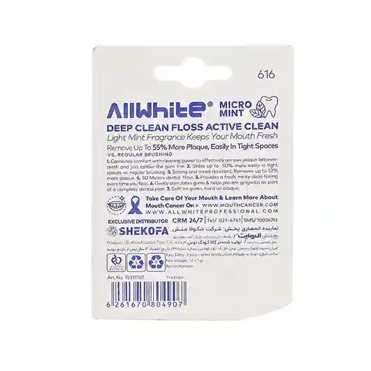 نخ دندان آل وایت میکرو مینت، محصولی برای تکمیل بهداشت روزانه دهان و دندان است. این محصول به پاکسازی نواحیای که مسواک به آنها دسترسی ندارد، کمک میکند. استفاده از نخ دندان به عنوان بخشی از برنامه مراقبت از دندان، برای از بین بردن پلاکهای انباشته شده بین دندانها و در امتداد خط لثه ضروری است و به پیشگیری از بیماریهای لثه کمک شایانی مینماید.