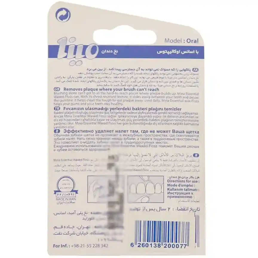 نخ دندان مومی مینا با فلوراید و اسانس اکالیپتوس محصولی از یک برند ایرانی و تحت نظارت وزارت بهداشت است که با بهرهگیری از ترکیباتی مؤثر مانند فلوراید، موم زنبور عسل و اسانس اکالیپتوس، به پاکسازی عمقی نواحی غیرقابل دسترس کمک میکند.