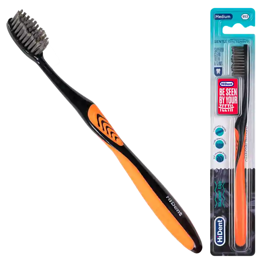 مسواک زغالی سوپرتیپ هایدنت با الیاف متوسط که مناسب همه دندان ها میباشد. دارای خاصیت سفید کنندگی بالا به علت زغال فعال موجود در ترکیبات.