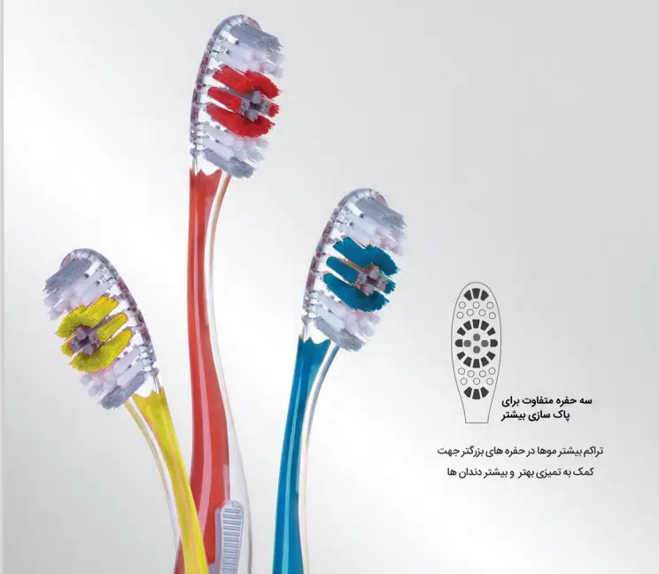 - برس با فناوری سه رنگ و عملکرد عمیق الیاف برس این مسواک به صورت سه رنگ و با فناوری خاص ساخته شدهاند که علاوه بر تمیزی عمیق دندانها، لطافت و محافظت کامل از لثه را تضمین میکند.