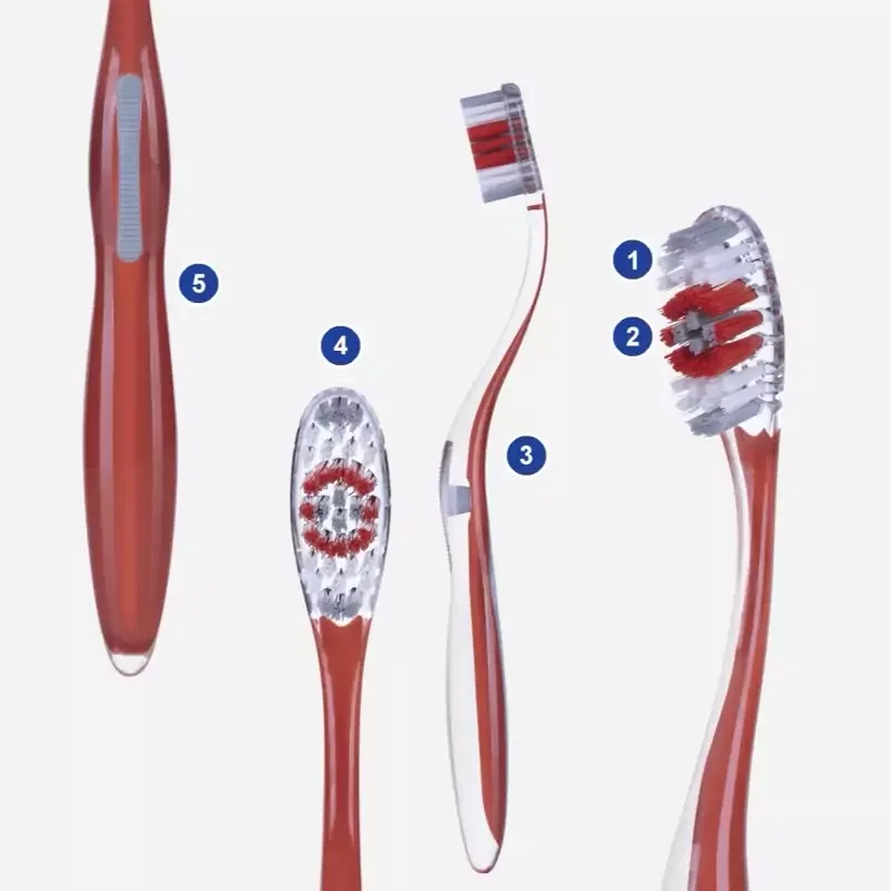 - الیاف نرم و گرد برای پاکسازی مؤثر بدون آسیب به لثه :الیاف نایلون 6.12 این مسواک با طراحی گرد شده (End-rounded) باعث میشوند در حین مسواک زدن، جرمها و پلاکهای دندان بهطور کامل حذف شوند، بدون اینکه آسیبی به بافت حساس لثه وارد شود.