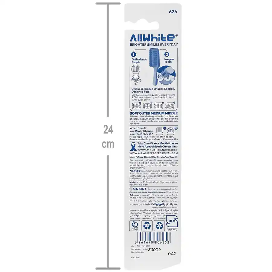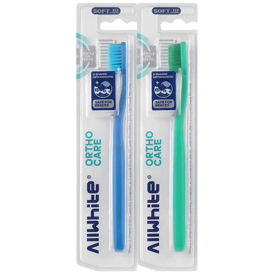 مسواک ارتودنسی U شکل AllWhite با برسهای نرم و طراحی ویژه برای افراد دارای بریس، دندانهای نامنظم و سالمندان، به پاکسازی دقیق پلاکها و حفظ سلامت دهان و دندان کمک میکند.