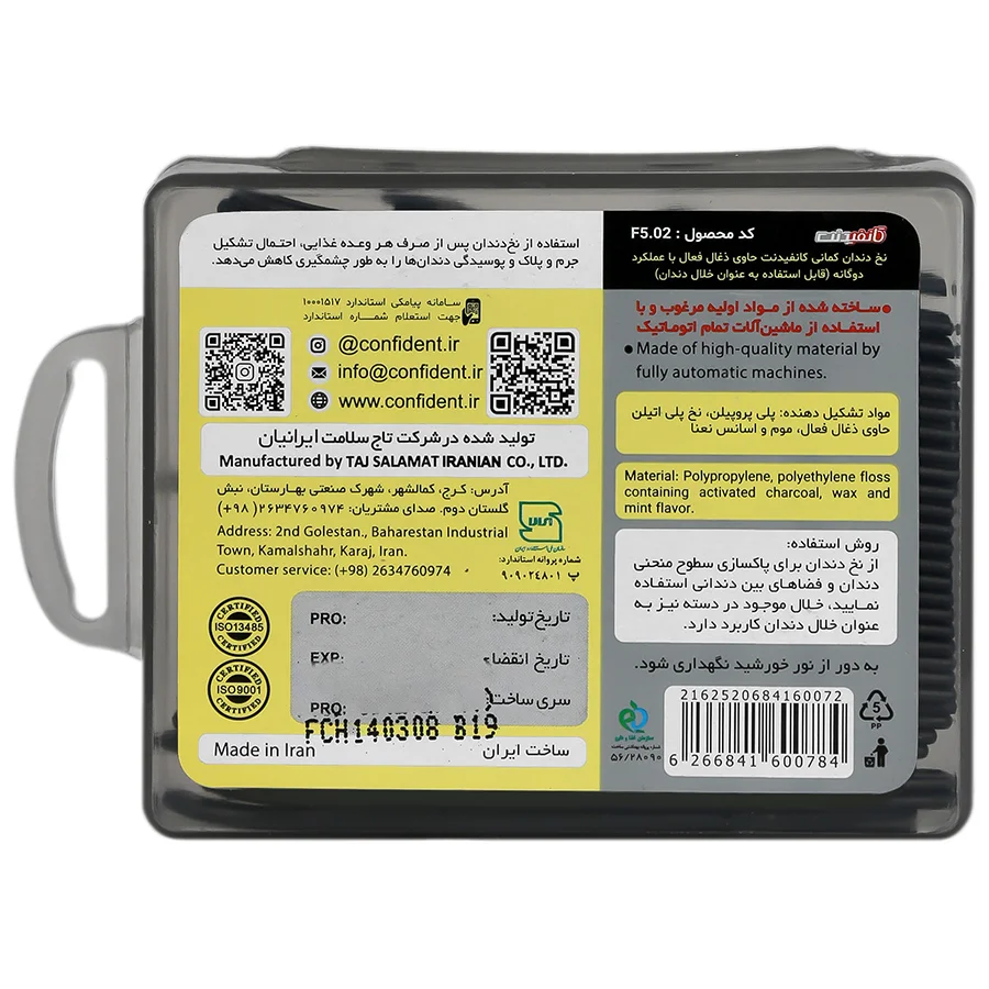 - استاندارد تولید و کیفیت ساخت: این کالا نمونه ای باکیفیت از نخ دندان ایرانی است که توسط شرکت تاج سلامت ایرانیان و تحت استانداردهای بین المللی ISO 13485 و ISO 9001 تولید شده است. اگر به دنبال جایگزینی مدرن برای نخ دندان سنتی هستید که همزمان نقش خلال دندان را نیز ایفا کند، ساختار مستحکم و طراحی مهندسی شده این محصول پاسخگوی نیاز روزانه شما خواهد بود.