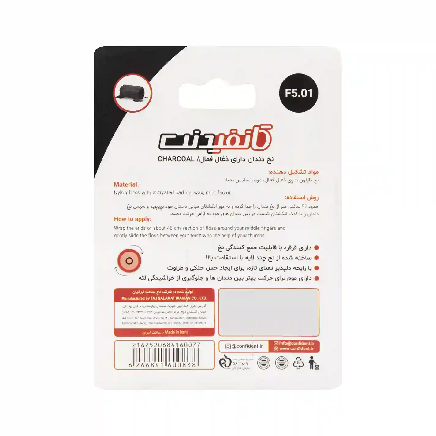 نخ دندان زغالی کانفیدنت (مدل Charcoal) با طول ۷۰ متر، یک محصول بهداشتی توسعه یافته جهت تکمیل فرآیند پاکسازی مکانیکی پلاک های دندانی است. این محصول که در دسته بندی نخ دندان ایرانی با کیفیت قرار می گیرد، با بهره گیری از فناوری های نوین تولید شده و دارای ساختاری چند لایه است. طراحی بسته بندی این محصول به صورت قرقره ای با قابلیت جمع کنندگی نخ است که استفاده بهداشتی و کنترل شده از آن را تضمین می کند. فرمولاسیون این نخ دندان کانفیدنت شامل نخ نایلون آغشته به زغال فعال، موم و اسانس نعنا می باشد و با توجه به ترکیبات ذکر شده، این محصول در رده محصولات بدون فلوراید طبقه بندی می شود.