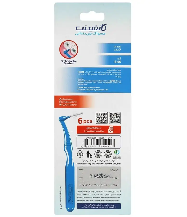 مسواک بین دندانی کانفیدنت سایز ۳ با قطر ۰.۶ میلی متر و دسته منعطف، راهکاری هوشمندانه برای پاکسازی پلاک های میکروبی از فواصل بین دندانی و اطراف براکت های ارتودنسی است که مسواک های معمولی توان دسترسی به آنها را ندارند؛ این محصول با بهره گیری از سیم روکش دار آلمانی و الیاف لطیف دوپونت، ضمن تضمین ایمنی لثه و مینای دندان، نظافتی کامل و دقیق را برای لبخند شما فراهم می آورد.