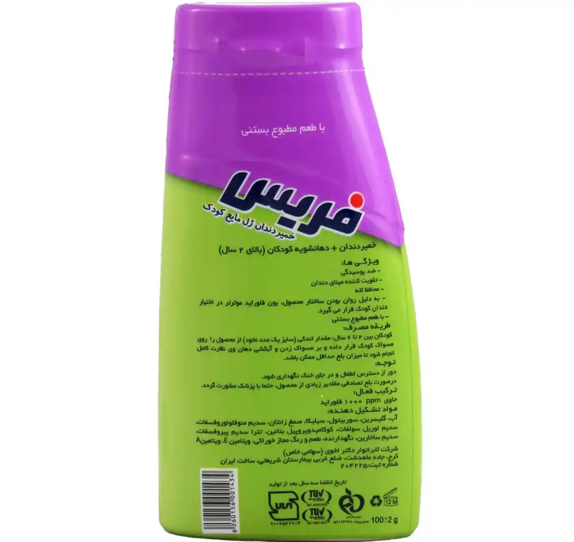 | مشخصات تکمیلی | خمیر دندان ژل مایع کودک فریس با طعم بستنی، مخصوص کودکان بالای ۳ سال، با فلوراید مؤثر برای جلوگیری از پوسیدگی و تقویت مینای دندان طراحی شده است. |