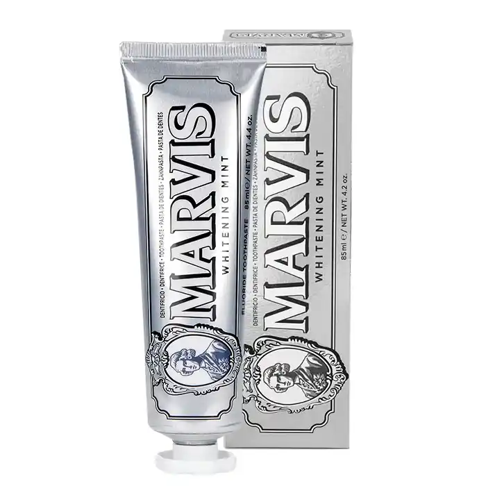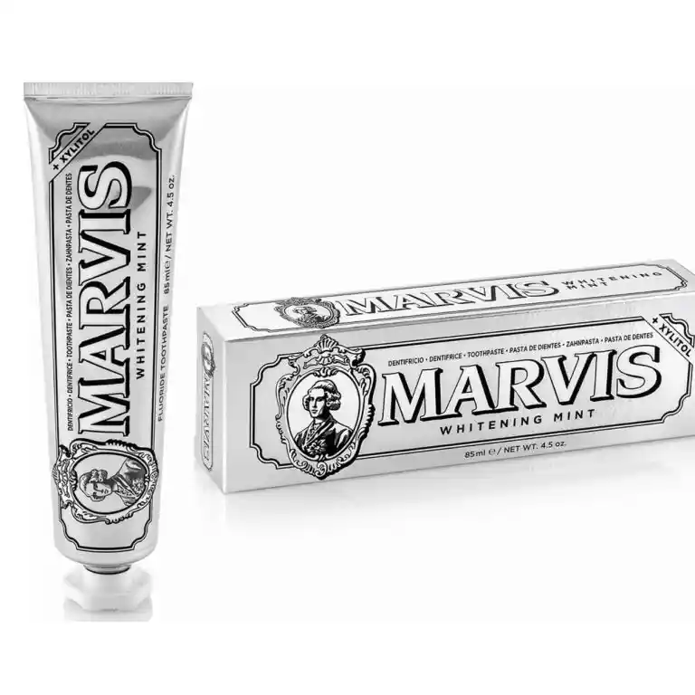 خمیردندان Marvis Whitening Mint نمادی از ظرافت، کیفیت و اصالت ایتالیایی است؛ محصولی از برند لوکس Marvis که سال‌هاست انتخاب افراد سخت‌پسند در سراسر جهان است. این خمیردندان با فرمولاسیونی پیشرفته و غنی، ترکیبی هوشمندانه از عوامل سفیدکننده ملایم و عصاره‌ی خنک‌کننده‌ی نعناع را ارائه می‌دهد تا هم‌زمان سلامت، زیبایی و حس طراوتی ماندگار را برای لبخند شما به ارمغان آورد.