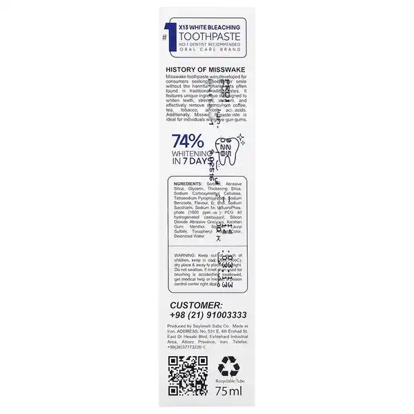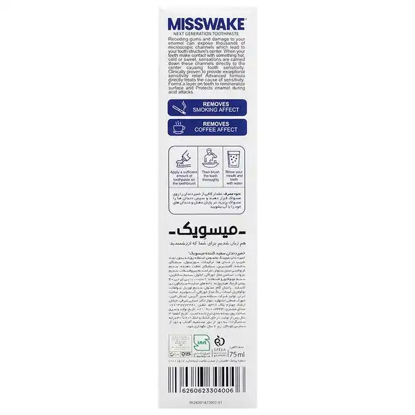 خمیردندان بلیچینگ Misswake با هدف ایجاد یک فرآیند سفیدکنندگی تدریجی، ایمن و سازگار با استفاده روزانه طراحی شده است. این محصول بدون بهره‌گیری از پراکسید هیدروژن، از ترکیباتی استفاده می‌کند که به روشن‌تر شدن تدریجی دندان‌ها کمک کرده و در عین حال از مینای دندان محافظت می‌نماید. وجود مواد موثر ضد پوسیدگی و ضد باکتری، همراه با طعم ملایم نعنا، این خمیردندان را برای افرادی که به دنبال استفاده روزانه و غیر تحریک کننده هستند مناسب می‌سازد. میزان سفید کنندگی در صورت مصرف منظم حداقل روزی یک بار می‌تواند تا ۷۴ درصد طی ۷ روز افزایش یابد.