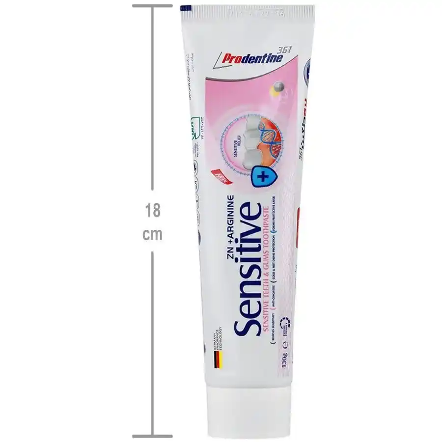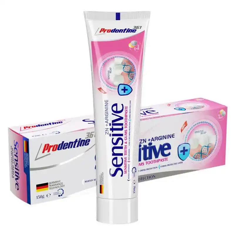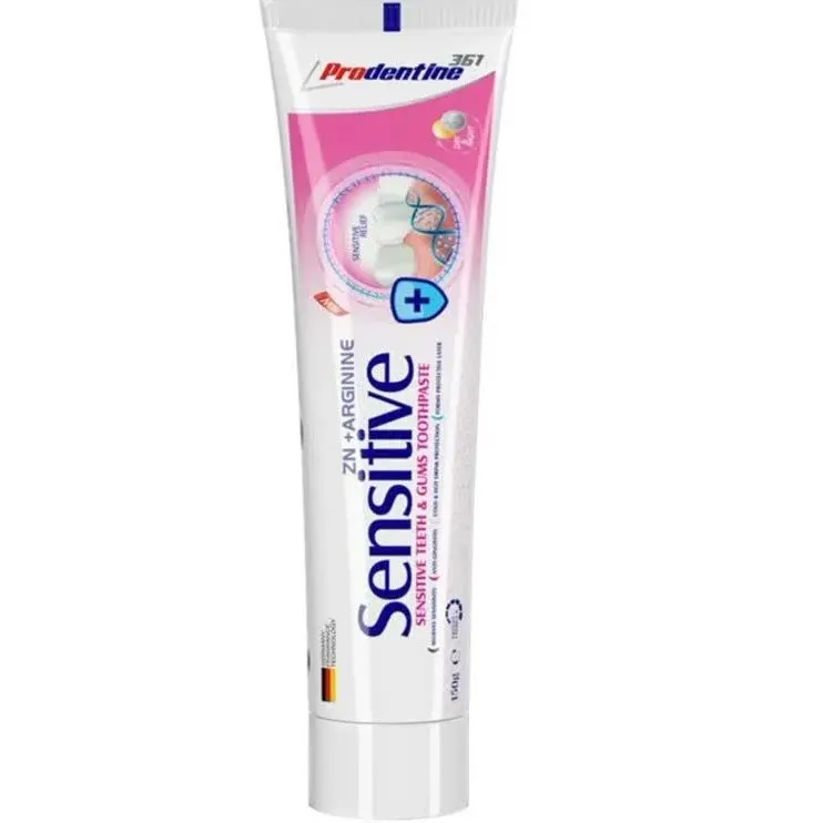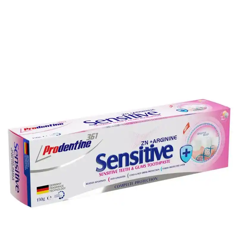 خمیردندان پرودنتین مدل sensitive مخصوص لثه و دندانهای حساس است وبه دلیل دارا بودن زینک سیترات و آرژنین از تشکیل پلاک جلوگیری و از عاج دندان محافظت میکند وهمچنین درد ناشی از حساسیت دندان و تورم و التهاب لثه را کاهش میدهد. خمیردندان سنسیتیو پرودنتین حاوی فلوراید بوده و از پوسیدگی دندان جلوگیری میکند.